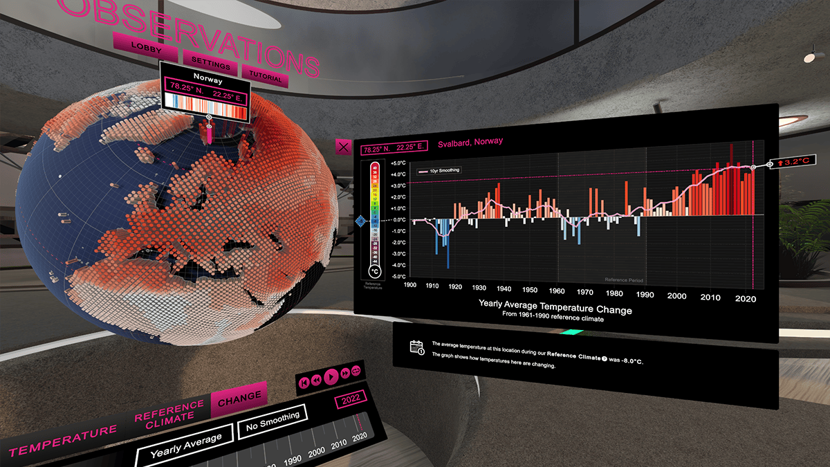 Climate Station uses the latest gaming technology to allow players to view, interact with, and understand complex climate data to raise awareness about climate change. The application tells the story of climate change through three acts: Weather Year, Observations, and Projections. There’s also an Explainer Library to explore.