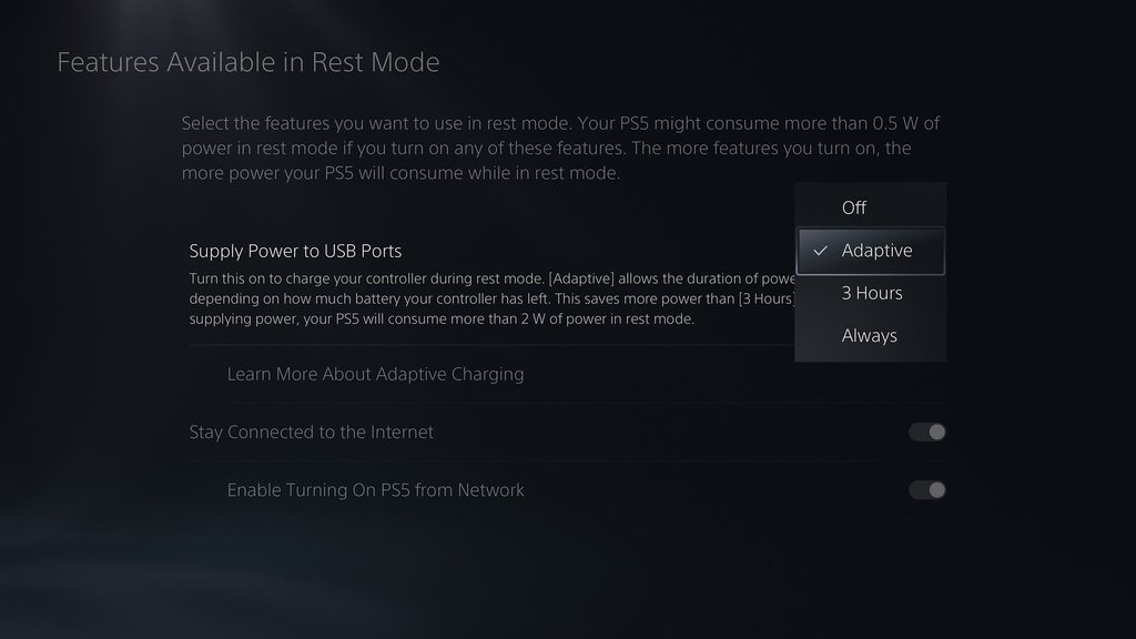 To use adaptive charging, go to [Settings] > [System] > [Power Saving] > [Features Available in Rest Mode], and then select [Supply Power to USB Ports] > [Adaptive]. After your PS5 enters rest mode, if a controller isn’t connected, the power supply to the USB port will stop after a certain period of time.