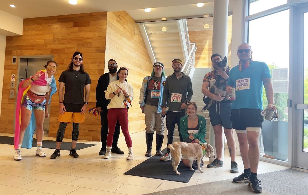 This year for Pride, Bend Studio kicked off the month by joining their local LGBTQIA+ community and participating in the Bend 5K, wearing their proudest Pride gear with a group from the team. Bend Studio also celebrated the month by bringing the festivities to the office with decorations placed in the streaming room and in the lobby where Deacon St. John stands with his bike. Additionally, virtual games bringing awareness to Pride were enjoyed by the entire team with some delicious Pride-themed snacks that were handed out in the studio.