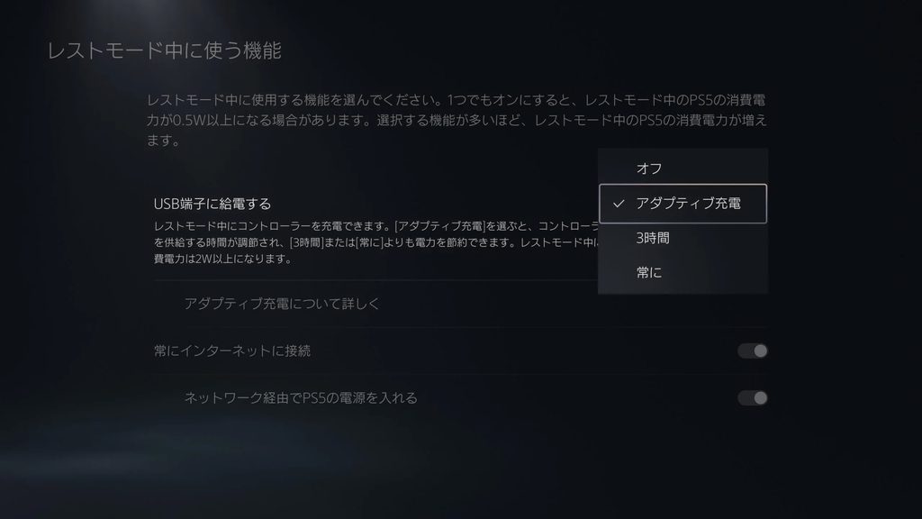 [USB端子に給電する]から[アダプティブ充電]を選択する:アダプティブ充電を利用することで、最適な時間でコントローラーを完全に充電できます。また、充電が完了すると電源供給が停止されるため、電力の浪費を防ぐことができます。 [3時間]または[常に]を選択した場合は、コントローラーの充電が完了すると、PS5本体の消費電力が増加します。 - レストモード中にサードパーティ製の周辺機器を充電する