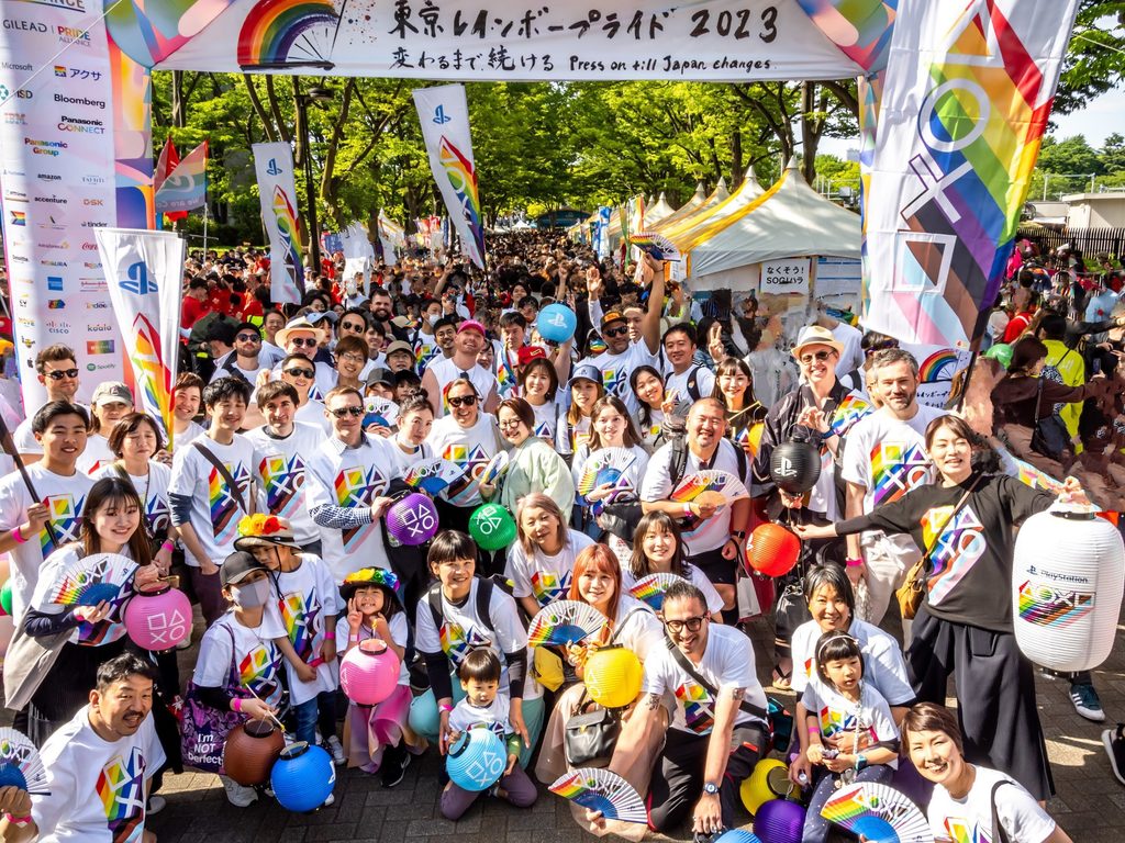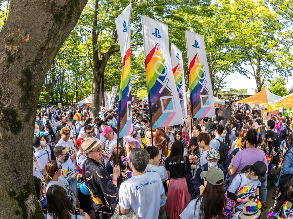 日本では、2018年より毎年「東京レインボープライド」のパレードに協賛しています。ファンには馴染みの深いPlayStationシェイプス(△○✕☐)を散りばめ、レインボーカラー加工を施した写真を撮影できるブースの設置のほかにも、日本のLGBTQIA+コミュニティーへの支持やアライとしての誇りを掲げた有志の社員が、パレードウォークに参加しました。また、パレードに先立ち、有名ドラァグクイーンのブルボンヌさんを講師にお呼びし、自己肯定感の重要性を知るための社内啓発イベントも行ないました。